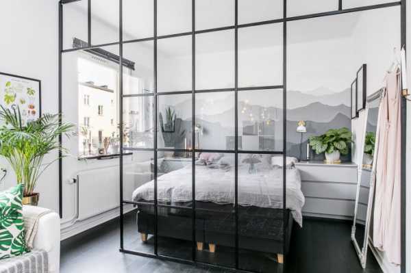 Не менее выгодное решение представляют собой стационарные перегородки, имеющие прозрачное исполнение или выполненные из легких материалов. В качестве разделителя, также уместно применение ширм или красивых витражных конструкций, добавляющих в обстановку интересных бликов и новых красок. Для условного отделения спального места, часто используют стеллажи или шторы.
