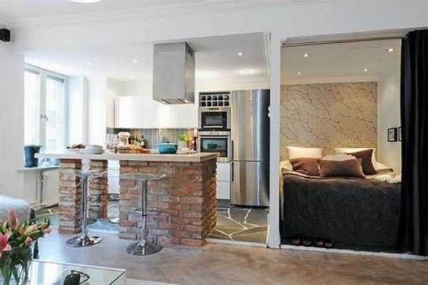Отличной практичной столешницей, может стать переоборудованный подоконник, а барная стойка послужит прекрасной заменой обеденному столу. При наличии ниши, в ней можно оборудовать кухню или разместить раскладной диван, предоставляющий дополнительное спальное место.