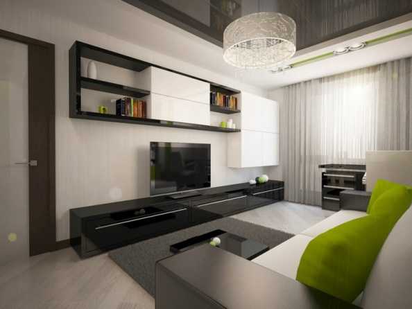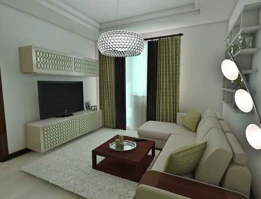 Гостиную в основном оформляют небольшим удобным диваном, предпочтительно в светлых оттенках, журнальным столиком, комодом, креслами или пуфиками. В дизайне не применяют крупные и слишком громоздкие предметы и большое количество украшений. Здесь гораздо уместнее использование встроенных конструкций и небольших ярких акцентов, в виде такого декора, как подушки, пледы, покрывала или шторы.