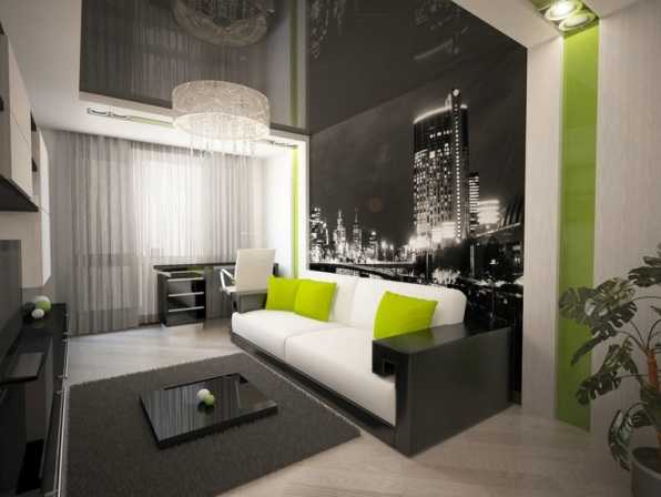 Общая комната привлекательна и практична. Ее изюминкой является стена с изображением ночного города, притягивающая взгляд, тем самым не позволяя концентрировать внимание на миниатюрных размерах помещения. Кроме того, дизайнер использовал хитрость, которая визуально расширила стены. Фото 3D с изображением небоскреба на заднем плане, зрительно отодвигает стену, а глянцевые поверхности, создающие оптические иллюзии, увеличивают размеры комнаты.