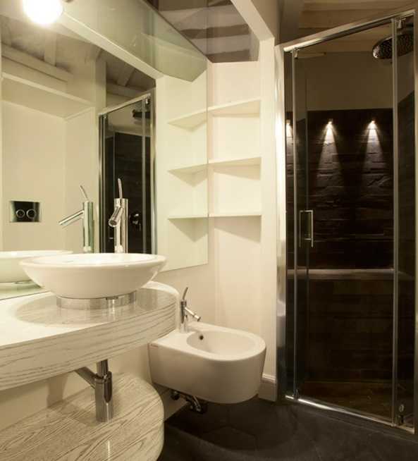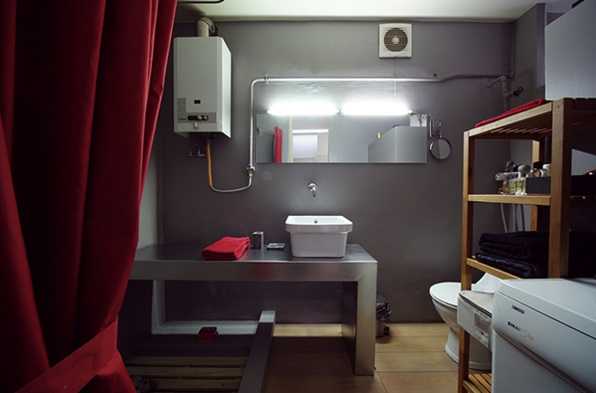 Ванная комната не менее оригинальна: блеск металла, тепло и аромат дерева, минимум мебели, открытые трубы идеально подчеркивают характер стилевого направления, делая помещение невероятно просторным.