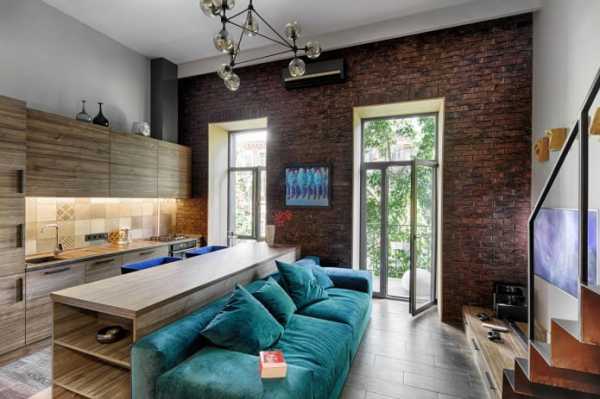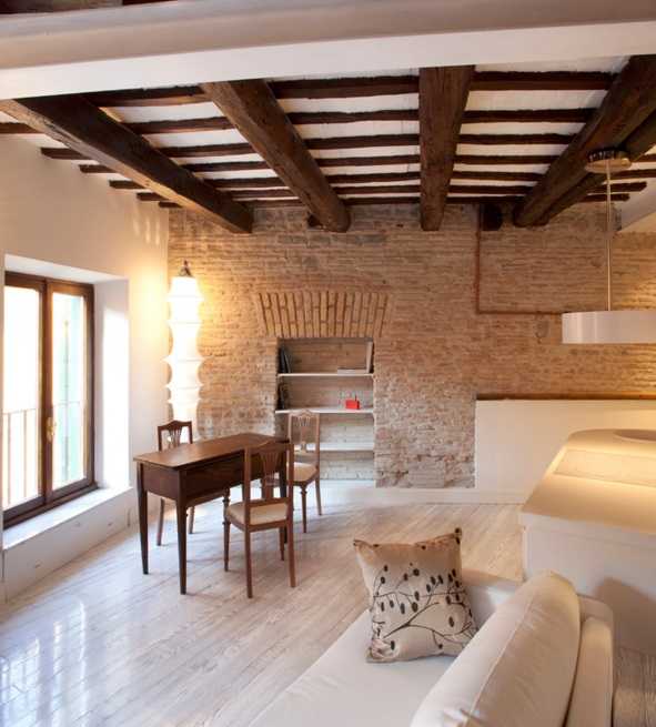 Жемчужиной квартиры является стена, оформленная декоративным кирпичом. Не менее эффектно смотрится потолок с грубыми балками из древесины.