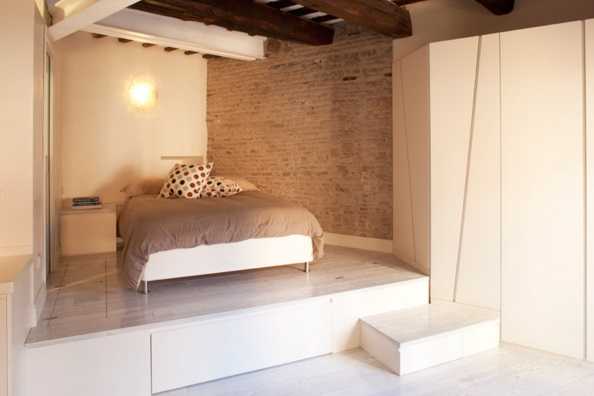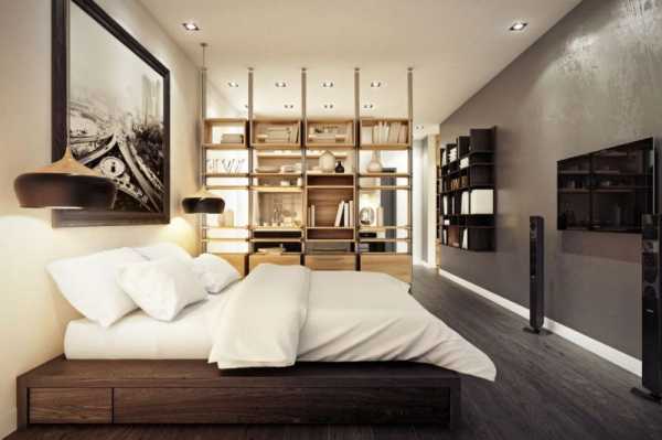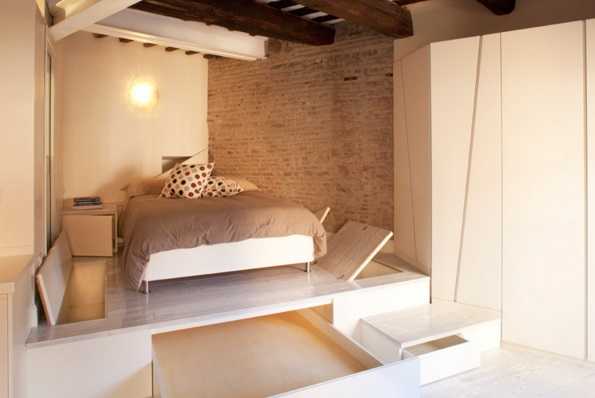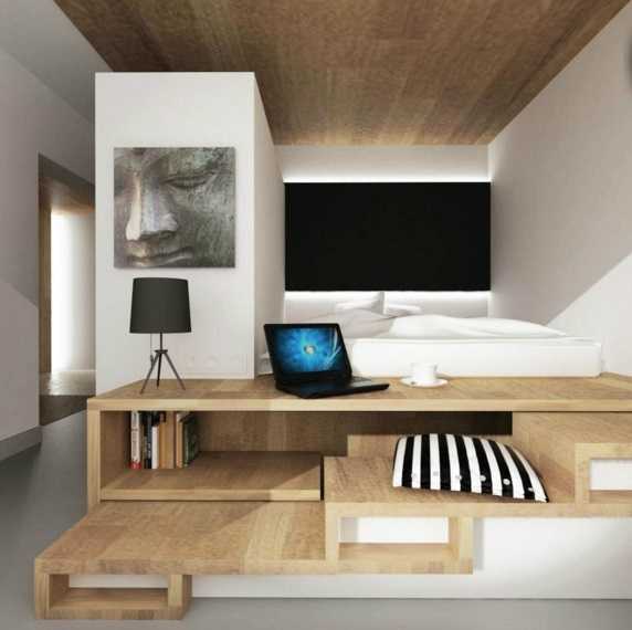 Не менее рациональным решением считается кровать, размещенная на подиуме, который представляет собой вместительное место для хранения различных вещей. В данном жилище, следует располагать только самые необходимые мебельные предметы, чтобы исключить лишнюю захламленность и перегруженность.