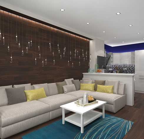 - Интерьер квартир студий 35 кв м, должен иметь минимум перегородок и стен. Если таковые имеются, по возможности уберите их или частично демонтируйте. Оставьте стены только в тех частях помещения, в которых они действительно будут полезны и необходимы (рабочий и спальный сектор). Для разделения пространства используйте различную мобильную мебель. Разграничить кухню и гостиную можно барной стойкой. Такой разделитель будет служить небольшим столиком, за которым вполне может обедать несколько человек. В качестве отделочных материалов можно использовать любые, в зависимости от выбранного стиля и оформления. Если вы хотите выполнить отделку каждой зоны различными материалами, необходимо чтобы цвета и фактуры стеновых и напольных покрытий соседствовали гармонично. Для этого не выполняйте резких переходов, используйте различные изгибы и закругления, декоративную окантовку. Подберите хорошее искусственное освещение (бра, настольные лампы, подвесные конструкции). Важно и то, как и где будет располагаться это освещение. Узнать больше об этом, вы можете в статье «Квартиры студии освещение»;