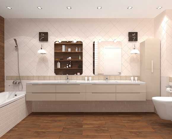 Покрытие пола может быть также выполнено в природных бежевых, серых, коричневых или светло-кофейных тонах, за счет комбинации светлого пола и стен, получается добиться значительного увеличения пространства.