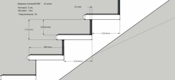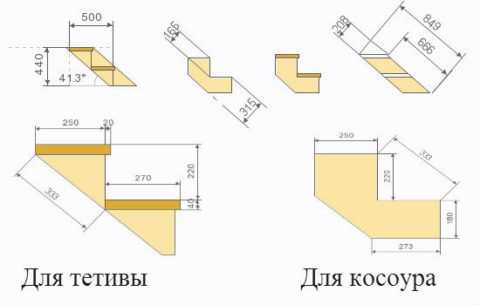 Косоур – брус или доска с выпиленными под каждую ступень площадками. На доске-тетиве под каждую ступень выбирается паз, но могут крепиться деревянные или металлические опоры. Следует отметить, что при ширине лестничного марша более 1,2 м необходим центральный косоур. Длина таких элементов, угол и расстояние между запилами или пазами/опорами рассчитываются на лестничном калькуляторе. Итак, расчёт ступеней крыльца произведён, имеются и остальные данные для будущей лестницы. Теперь несложно посчитать необходимое количество пило — и отделочных материалов, крепежа.
