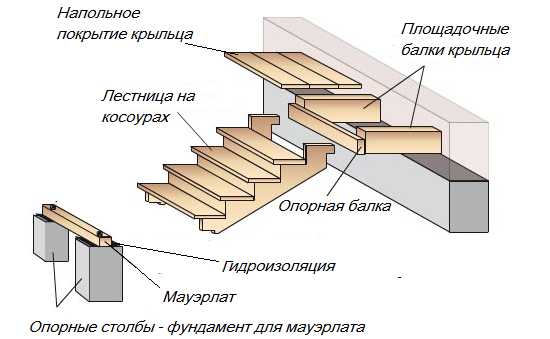 Нижняя часть лестницы для крыльца находится на уровне тротуара или садовой дорожки. Для её закрепления требуется устроить фундамент с опорным брусом-мауэрлатом. Фундамент может быть столбчатым, плитным, ленточным – это зависит от типа грунта и нагрузки. Обязательна гидроизоляция фундамента и мауэрлата. Параллельно надо готовить деревянные элементы. Они будут работать в условиях высокой и низкой влажности, поэтому обязательное условие – трёхслойная пропитка биопиренами (барьер для насекомых и гнилей с дополнительной защитой от возгорания).
