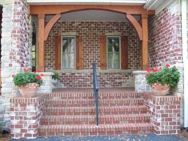 Клинкерные ступеньки на крыльце. Фото широкой удобной уличной лестницы