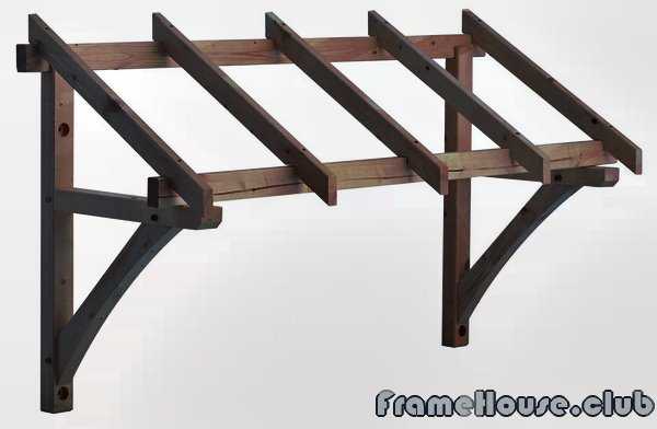 Навес опирается на стену и столбы, установленные по краям настила. Форма, материалы должны быть стилистически едиными со зданием.