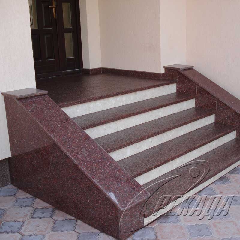 Гранитные ступеньки для крыльца смотрятся очень красиво и вместе с тем солидно. Этот камень очень фактурный, он не требует никаких украшений. Крылечки с этой отделкой часто выполняются в минималистичном стиле, а массивные перила с балясинами в сочетании с гранитом встретить довольно сложно. Ступени для крыльца, фото которого вы видите ниже, выполнены из красного гранита, с нанесенной по краю полосой против скольжения.