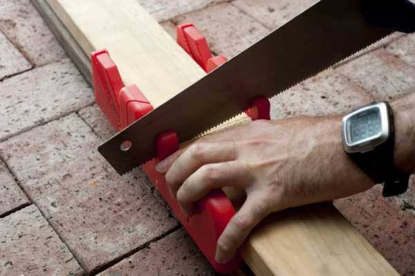 Заготовка широкими сторонами прижимается к подошве и внутренней стороне боковой стенки стусла. Зубья ножовочного полотна направлены в сторону упорной стенки, в этом же направлении производится силовой нажим.