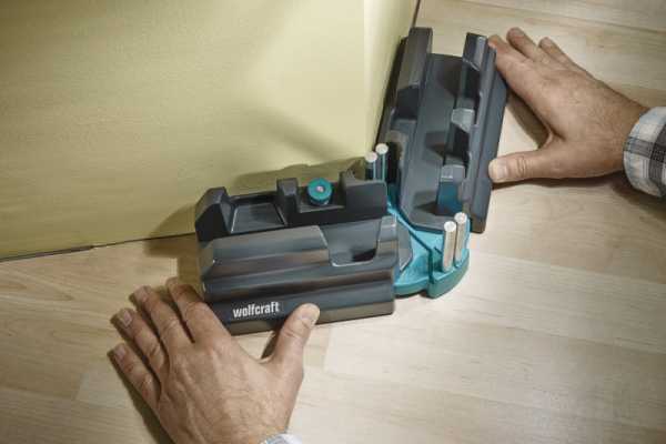 - Берём левую планку плинтуса в левую руку и прижимаем к дальнему от нас бортику плотницкого инструмента.