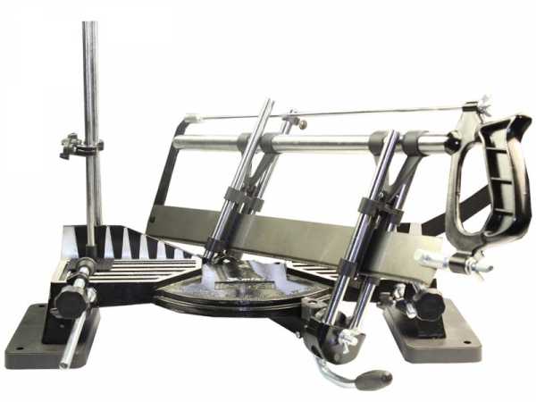 Подобное стусло не только дает возможность точных регулировок, вплоть до долей градуса, но и обеспечивает правильную постановку режущего полотна. Это обусловлено благодаря особой конструкции его рамки. Она жестко закрепляется на 4 штырях, выходящих из станины, на которой крепится деталь. Рамка ножовки остается неподвижной, в то время как каркас, закрепляющий пильное полотно, скользит по заданной траектории. Благодаря этому исключается человеческий фактор в виде содрогания рук и неправильного уклона пилы.