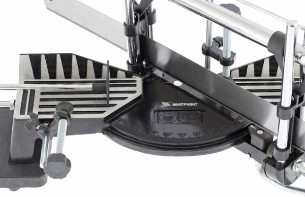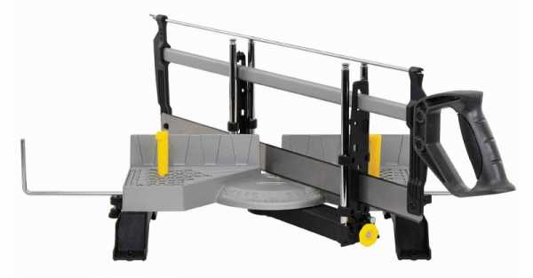 Он имеет зафиксированное основание, надёжную и стойкую поворотную часть. Также оборудован направляющий элемент для ручной ножовки. Он может быть закреплён с точностью до одного градуса, что позволяет отрезать материал очень ровно и в нужном градусе.