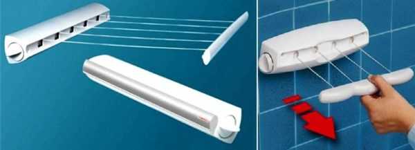 Правда, на этот случай выход есть – можно приобрести специальный комплект для сушки белья, устройство инерционного типа. На одной торцевой стене в этом случае крепится блок с барабаном внутри, на который намотаны веревки, образующие несколько параллельных рядов, закрепленных на одной планке. На противоположной стене крепится специальный зацеп для этой планки.