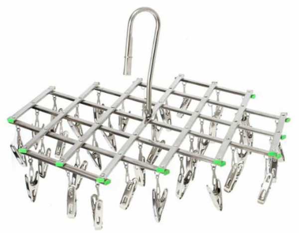 Самые простые подвесные сушилки – это рамки, изготовленные из пластмассы или металла, имеющие сверху идущие от углов цепочки или шнуры, оканчивающиеся в вершине «пирамиды» крючком. За этот крюк такую сушилку несложно повесить к кольцу на потолке или даже просто на бельевую веревку.
