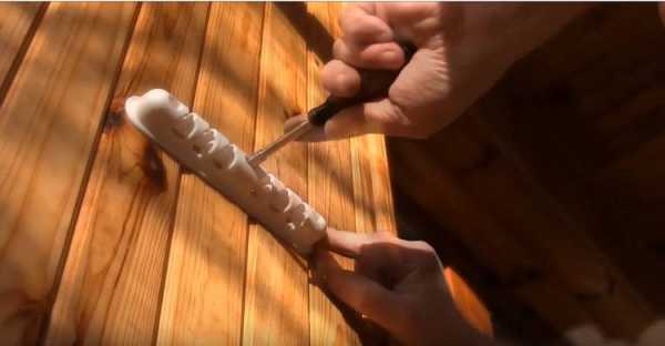 - Для фиксации управляющего конца в нужном положении может быть предусмотрено любое удобное хозяину решение, например, такое, как показано на картинке – кронштейн с высверленными отверстиями, через которые пропущен сам шнур. Аккуратно стравливая шнур или, наоборот, вытягивая его вниз, производят опускание и подъем этой потолочной сушилки.
