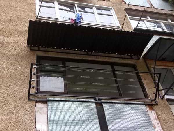 - Первый вариант, один из самых распространенных – это веревки, натянутые между двумя балками-кронштейнами, вынесенными за пределы балкона.