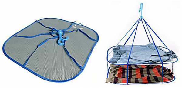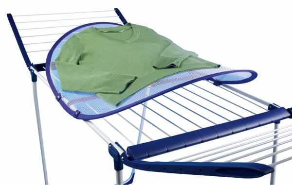 Другая разновидность подобного класса – это сушилки, предназначенные для предметов одежды, которые в силу их особенности не рекомендуется развешивать на перекладинах или фиксировать прищепками, например, шерстяных вязанных вещей. Подобные приспособления имеют натянутую на рамку полимерную сетку, на которой раскладываются постиранные вещи.