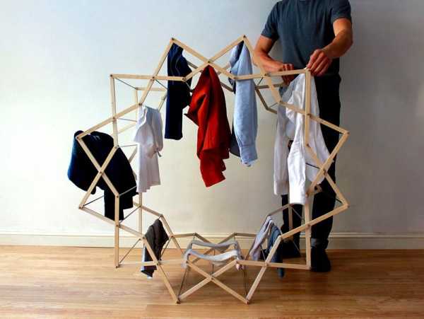 Оснащены двумя-тремя крюками большого диаметра, которые позволяют цеплять конструкцию за горизонтальные перегородки, например, за балконное ограждение. Располагать их можно внутри помещения или снаружи, так что вариант мобильный и удобный. Вот только под хранение надо найти место или сделать на стене петли, за которые можно зацепить навесную сушилку для белья.