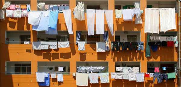 Нет никакой гарантии того, что сверху на сохнущие вещи не попадут загрязнения – птичий помет, мелкий мусор с вышерасположенных балкона, сметаемая с крыши пыль и т.п. При сильных порывах ветра мокрое белье может начать «возить» по ограждению балкона или по бетонной плите. Висящие простыни или пододеяльники нередко вызывают раздражение у хозяев балкона этажом ниже. Кроме того, честно сказать, и красивого в этом – очень мало. А если балкон выходит на фасадную часть здания, то подобную сушку и вообще могут запретить – это правило действует во многих населенных пунктах.