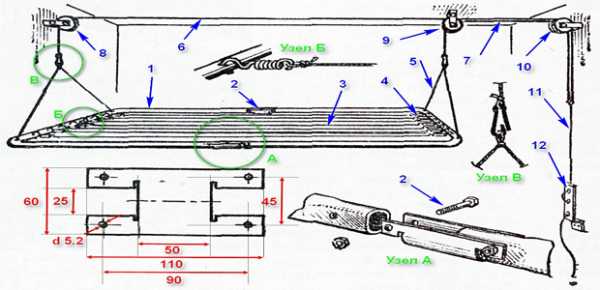 Кстати, подвесную потолочную сушилку необязательно приобретать в магазине. Хороший хозяин всегда сможет изготовить сходную модель, ничуть не хуже заводской. Тот, кто «дружен» со столярным работами, способен смастерить деревянную конструкцию, как на иллюстрацией выше – две траверсы, соединенные перекладинами. Другой вариант – это рамная конструкция, для которой можно использовать отслужившую свое раскладушку, валяющуюся в гараже или сарае. Посмотрите на чертеж – что здесь сложного?