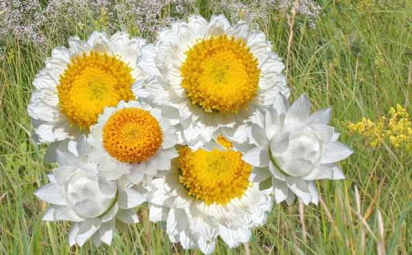 Гелихризум (бессмертник, цмин, «кошачьи лапки»). Может иметь простые и махровые соцветия белого или красного цвета, выведены сорта с многоцветными соцветиями. На расстоянии пушистые соцветия очень напоминают мягкие лапки кошек, что и стало основанием для народного названия. Заготовку материала начинают в полуроспуске.
