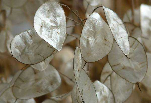 Лунария (лунник). Одно из немногих сухоцветов, которое способно украсить и летний сад своим цветением, и дом своими плодами. Для аранжировок используют не совсем плоды, а оставшиеся элементы после разрушения стручков. Полупрозрачные перегородки в форме луны смотрятся очень мило.