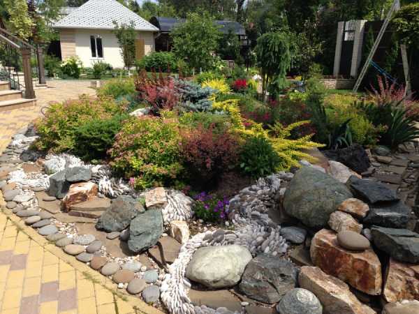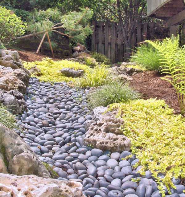Теперь давайте подумаем, какие же могут быть недостатки у сухого ручья? Ну, разве что камни могут чрезмерно нагреваться в особо жаркие дни и неблагоприятно влиять на рядом растущие растения… Спасти ситуацию поможет периодическое увлажнение каменного русла.