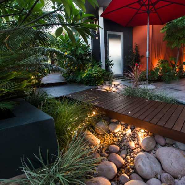 - Светильники. Использование подсветки вдоль ручья позволит любоваться композиций в темное время суток. При искусственном освещении камни начинают «играть» и переливается с новым оттенком.