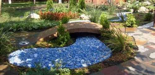 Поверхность сухого ручья можно выложить синей галькой и гравием или, например, украсить небольшими стеклянными синими гранулами, в общем, фантазируйте и воплощайте свои фантазии в жизнь.