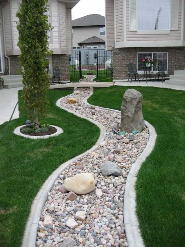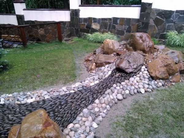 Не менее красивый искусственный ручей получится, если его русло выложить из щебня, а берега оформить большими камнями.