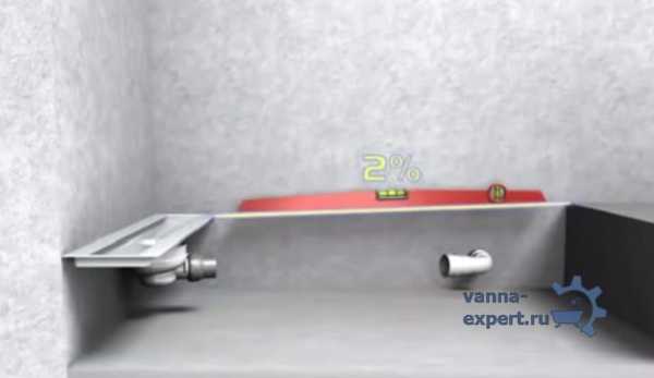 Шаг 5. Проверяют уклон пола уровнем – он должен быть не менее 2% от края стяжки до бортика желоба.