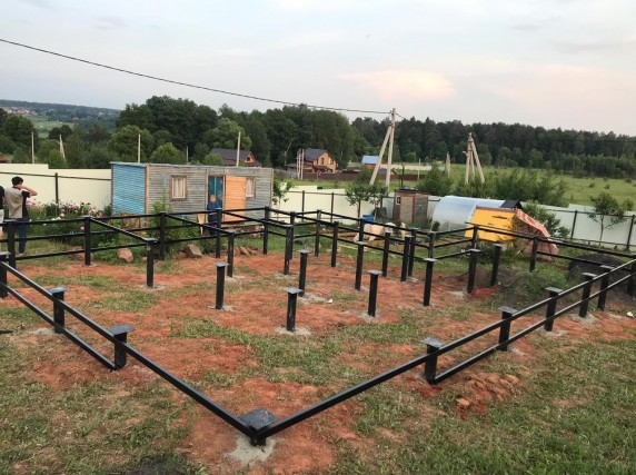 Конструкции необходимо установить на определенном расстоянии друг от друга (не более 3 м). При несоблюдении данного правила фундамент не наберет нужную несущую способность и в будущем может возникнуть провисание обвязочного бруса. - Разметка свайного поля.