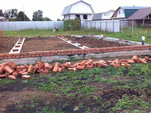 Далее необходимо вывести цоколь — 3 ряда кирпича. Желательно взять красный кирпич, так как его хорошо обжигают, он не впитывает воду, и не пропускает её через себя.