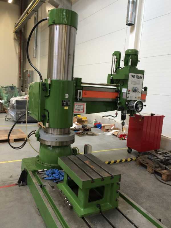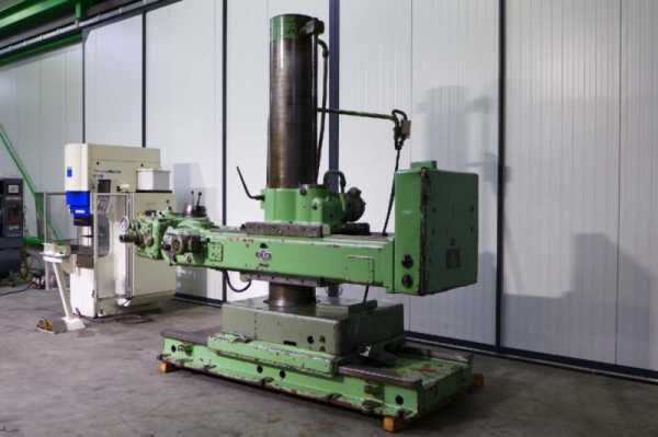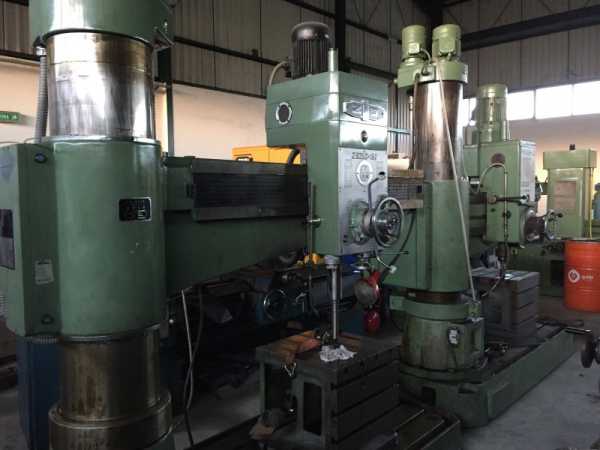 - Радиально-сверлильные станки. Принцип работы отличается от вертикальных тем, что заготовка крепится в определённом положении на столе или плите, а относительно неё перемещается инструмент, закреплённый в шпинделе. Для крепления детали у плиты имеются пазы в виде буквы «Т». Некоторые станки относится к разряду переносных, имеют поворотную шпиндельную головку, чего не имеют станки вертикально-сверлильной группы. Диаметр сверления до 100 мм. Используется, как правило, для сверления заготовок большой массы и габаритов. Как в любом правиле, существуют исключения, поэтому станки этого вида можно встретить в цехах массового производства. Частота вращения и подача регулируются за счет переключения рукояток. Кроме этого, на станке может регулироваться высота расположения шпинделя путем перемещения траверсы по колонне. Траверса перемещается вручную в зависимости от необходимой высоты расположения инструмента для обработки.
