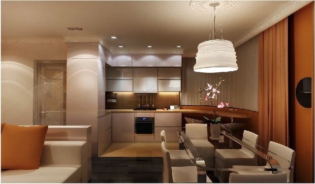 Кухонный сегмент должен обладать более насыщенным и качественным освещением, а гостиная иметь приглушенный и будуарный свет.