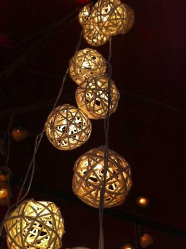 Создайте симпатичные шарики-плафоны из ниток, бечевки, белой бельевой веревки: надуваем небольшие шарики, обматываем вокруг них веревку, смазанную клеем ПВА, после высыхания клея лопаем и вынимаем шарик. Продеваем провод с лампочкой – красивые самодельные плафоны готовы!