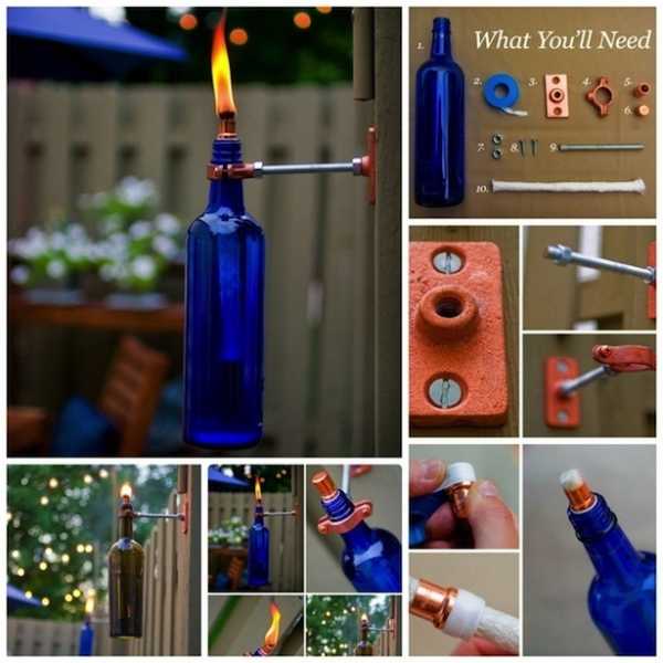 Еще одна интересная идея – керосиновые лампы из бутылок. Потребуют некоторых трудозатрат, зато результат получится необычным и бюджетным.