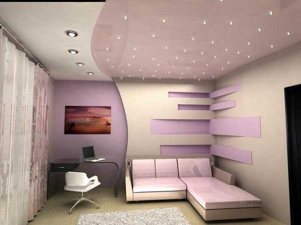 Для детской подойдет вариант зонирования с помощью светильников. Это можно сделать, расположив группу светильников над игровой или рабочей зонами комнаты. В остальной части потолка можно расположить источники рассеянного света. Каждую группу светильников можно обеспечить отдельным выключателем, что позволит создавать при необходимости в комнате полумрак. Благодаря точечным светильникам можно создать в детской настоящую сказку, расположив источники освещения на натяжном потолке в виде красивой фигуры, используя для этого лампы различной формы и цвета.