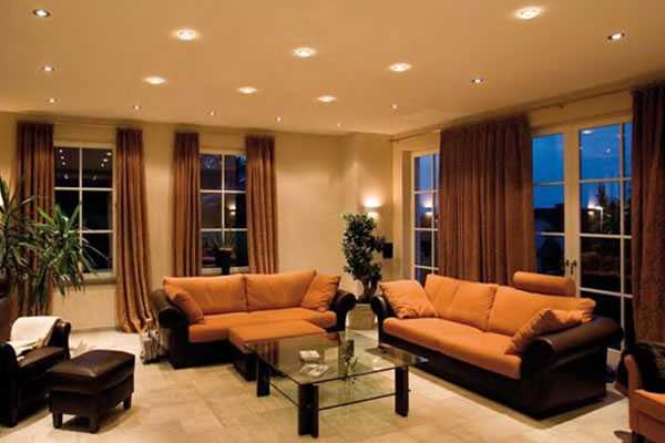 В гостиной источники освещения лучше всего располагать по периметру, сочетая их с люстрой в центре. Таким образом у вас будет возможность в любой момент изменять яркость освещения. В любом случае, какой бы вариант размещения светильников вы не выбрали, в гостиной никак не обойтись без центральной люстры. Использование исключительно точечных светильников зачастую применяется в небольшой по площади гостиной, как продемонстрировано в подборке фото.