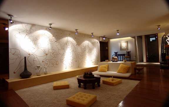 Наилучшим сочетанием для зала считаются люстра и точечные светильники. Относительно главного источника света мнения достаточно консервативны — люстра должна располагаться по центру помещения. Точечные источники располагают в виде геометрических фигур и их фрагментов, симметричных относительно люстры. В зале с несимметричными многоуровневыми потолками часто обходятся без центрального освещения. Светильники располагают с учетом формы уровней, равномерно охватывая помещение или выделяя в нем несколько условных зон.