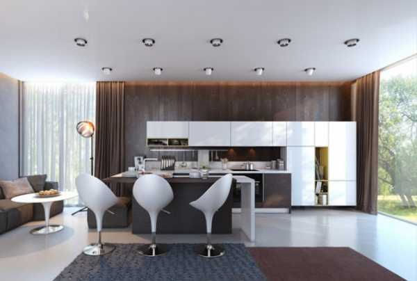 В большинстве квартир кухня и столовая являются одним помещением, но выделение функциональных зон здесь встречается редко. Точечные светильники равномерно размещают по всей площади помещения, стараясь охватить и периметр, и центр. Такое расположение обеспечивает хорошую освещенность при минимуме теней. При недостатке света в рабочей зоне устраивают дополнительную местную подсветку.