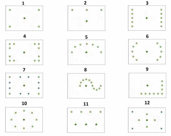 Размещение осветительных приборов влияет не только на качество освещения, но и на восприятие помещения в целом. Продуманный дизайн натяжных потолков с точечными светильниками может сделать маленькое помещение просторней, а огромный зал — теплым и уютным. Разместить 2-3 точечных светильника не сложно, но с ростом количества точек число вариантов установки растет в прогрессии. Приводимые ниже наброски могут стать базой для самостоятельной проработки светового оформления помещений.