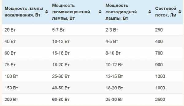 Таблица соотношения мощностей светодиодных ламп и ламп накаливания