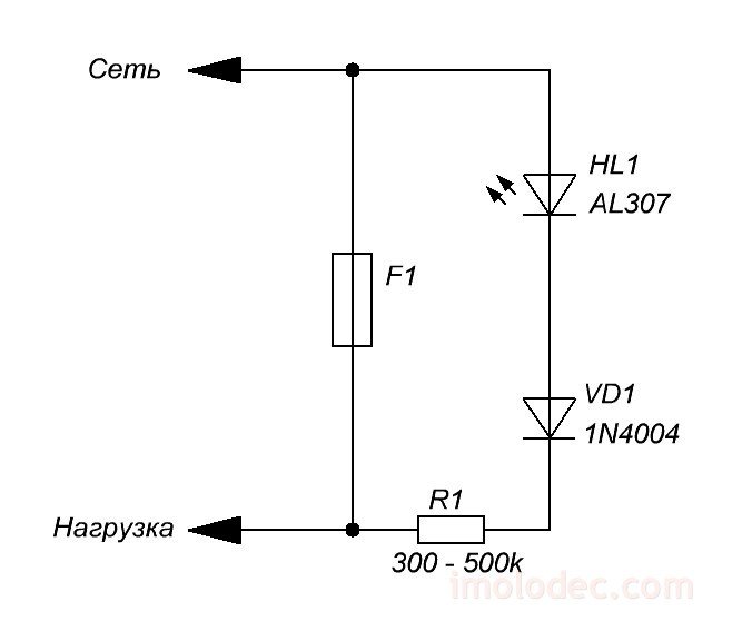 Светодиод HL1 загорается ярким красным цветом. Рассеиваемая мощность на R2 при напряжении питания В не превысит 0,7 Вт. При аварии в сети электроснабжения входное напряжение питания около В собственно, при этом как раз и обязан перегореть FU1 , рассеиваемая R2 мощность не превысит 2 Вт, что хоть и приведет к его сильному разогреву, но не способно вызвать его возгорание.