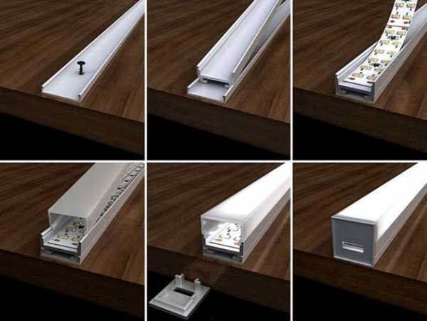 Для организации внутренней подсветки применяется специальный профиль из алюминия, имеющий место для установки ленты и монтажа под стекло. Свет, излучаемый диодами, направляется внутрь стеклянной поверхности, рассеивается и создается впечатление, будто все стекло превращается в светильник.