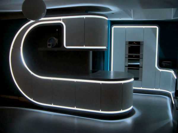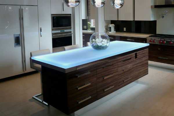 - Освещение прозрачной или полупрозрачной столешницы изнутри путем установки светодиодной ленты по ее контуру.