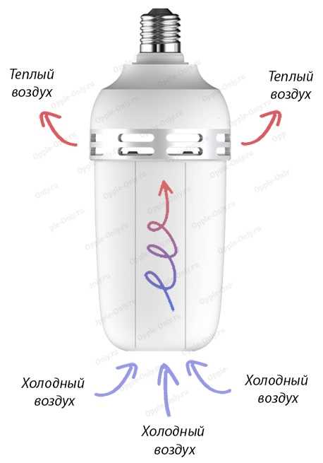 Для поддержания допустимого режима нагрева, лампы оборудуются, либо внутренними, либо внешними активными радиаторами, выполненными в виде множественных ребер. Корпус светодиодных ламп большой мощности выполняется комбинированным, где материалом для несущей цокольной части служит алюминиевый сплав, а в качестве плафона используется колба из прочного термостойкого полимера.