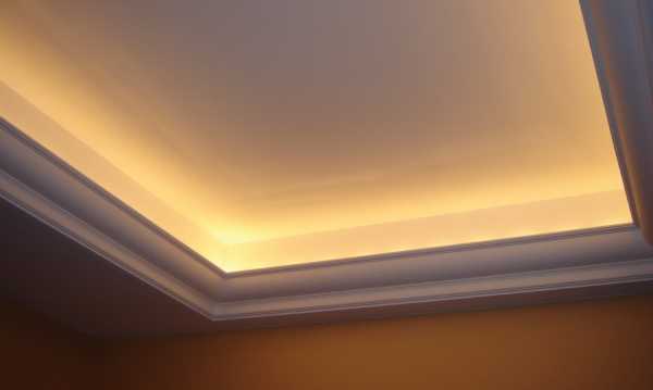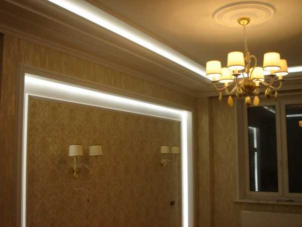 Эффектно светодиодное освещение выглядит на выступах потолка, а замаскировать ленты помогут жидкие обои.